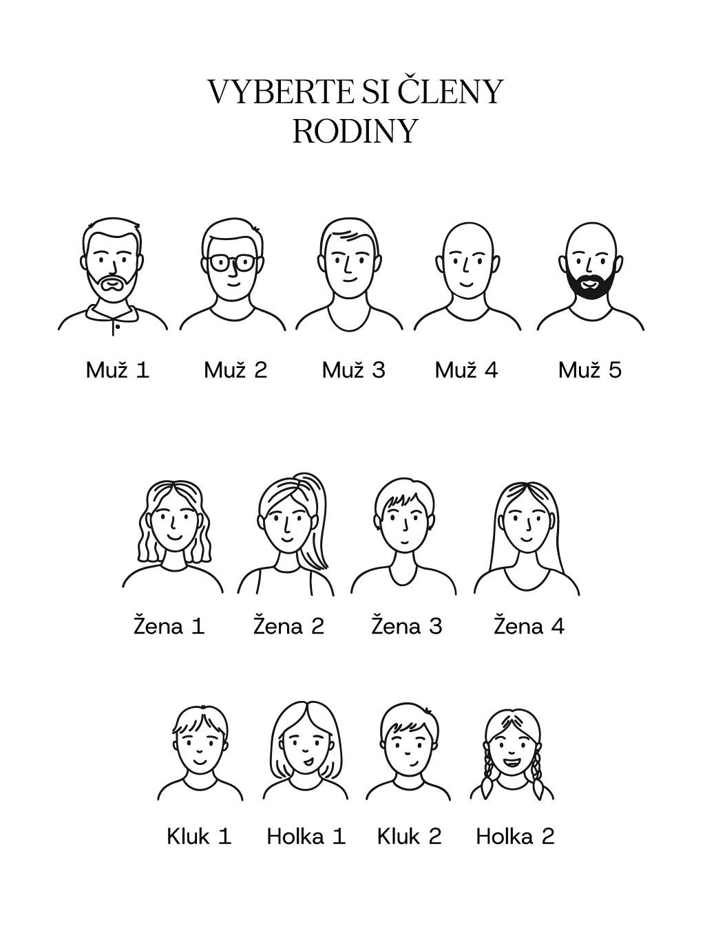 Možnosti personalizace: v možnostech personalizace je změna textu a "hlav". Pracujeme s několika obrázky hlav, které budou reprezentovat vaše členy rodiny. Je to čistě reprezentační vektor, tak prosím počítejte s tím, že se nebude přesně podobat. Pokud byste chtěli přidat k designu další prvek či symbol, zvolte prosím produkt Design na míru nebo Ilustraci na míru. Na následujících fotkách uvidíte obrázky hlav, z kterých můžete vybírat a kombinovat je. Napište do poznámky, jaké chcete.