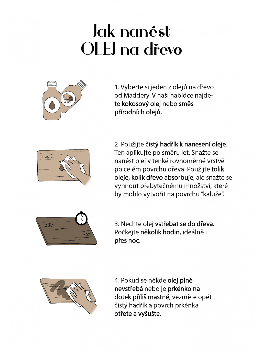 Jak často provádět údržbu: Údržbu olejováním a voskováním bychom měli provádět vždy, když je dřevěný výrobek vysušený. Čím častěji výrobek používáme, tím častější péči vyžaduje. Každodenně používaná kuchyňská prkénka je vhodné olejovat nebo voskovat jednou měsíčně. Používáte-li prkénko méně často, postačí údržba jednou za čtvrt – půl roku.