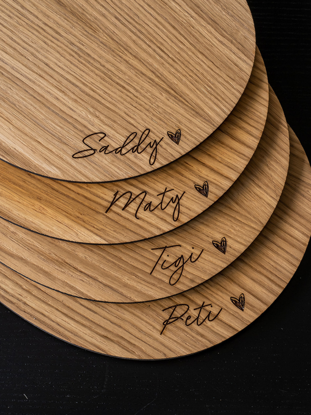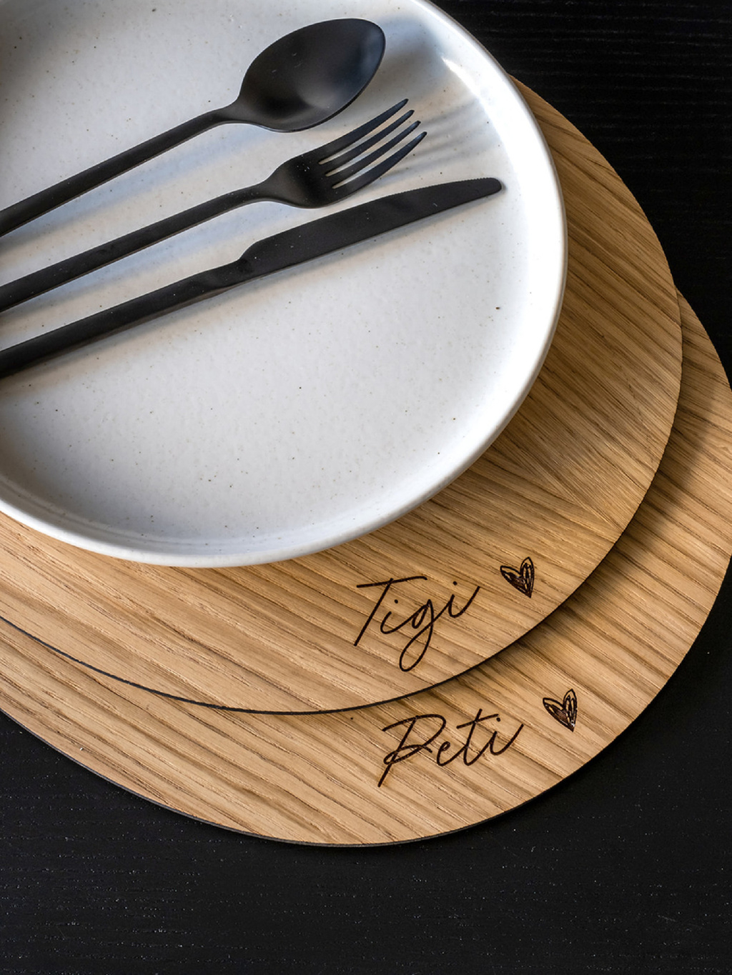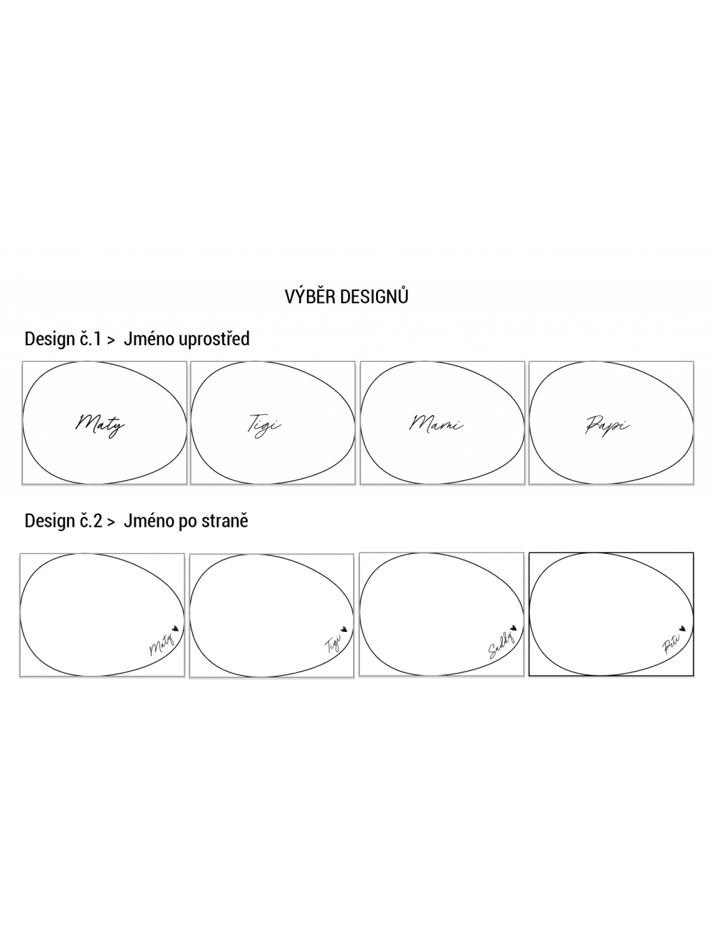Designy se jmény jsme přitom navrhli tak, aby stále vypadali minimalisticky, byly lehce čitelné a hodily se do každého domu. Design se jménem uprostřed bude hezky vidět, než se vaše rodina usadí a potom zmizí pod talířem. Naopak design se jménem po straně bude viditelný i po umístění talíře.